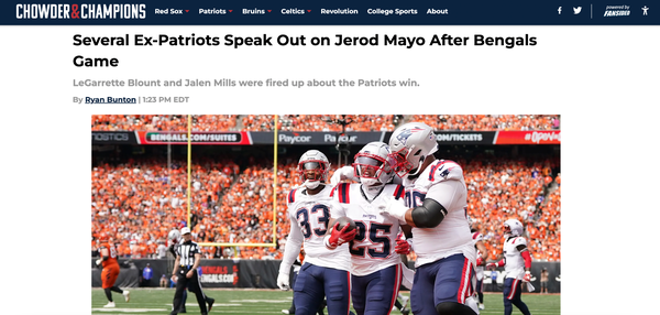 Chowder and Champions • September 9th, 2024 Several Ex-Patriots Speak Out on Jerod Mayo After Bengals Game LeGarrette Blount and Jalen Mills were fired up about the Patriots win.