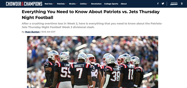 Chowder and Champions • September 17th, 2024 Everything You Need to Know About Patriots vs. Jets Thursday Night Football After a crushing overtime loss in Week 2, here is everything that you need to know about the Patriots-Jets Thursday Night Football Week 3 divisional clash.