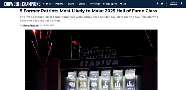 Chowder and Champions • September 19th, 2024 5 Former Patriots Most Likely to Make 2025 Hall of Fame Class The Pro Football Hall of Fame nominees were announced on Monday. Here are the five Patriots who have the best shot at Canton.