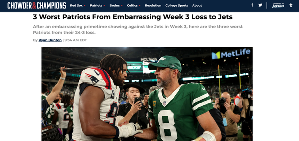 Chowder and Champions • September 20th, 2024 3 Worst Patriots From Embarrassing Week 3 Loss to Jets After an embarrassing primetime showing against the Jets in Week 3, here are the three worst Patriots from their 24-3 loss.