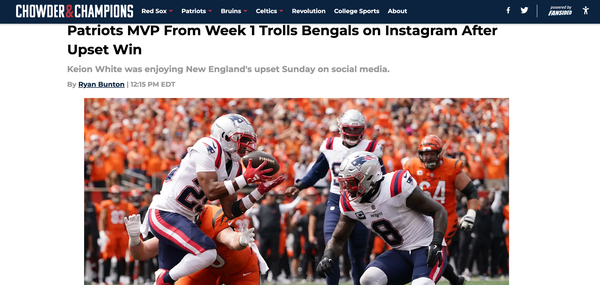 Chowder and Champions • September 9th, 2024 Patriots MVP From Week 1 Trolls Bengals on Instagram After Upset Win Keion White was enjoying New England's upset Sunday on social media.
