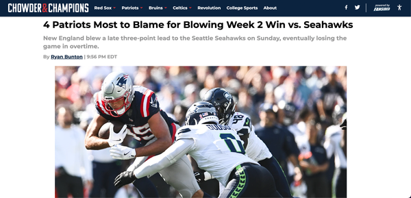 Chowder and Champions • September 16th, 2024 4 Patriots Most to Blame for Blowing Week 2 Win vs. Seahawks New England blew a late three-point lead to the Seattle Seahawks on Sunday, eventually losing the game in overtime.